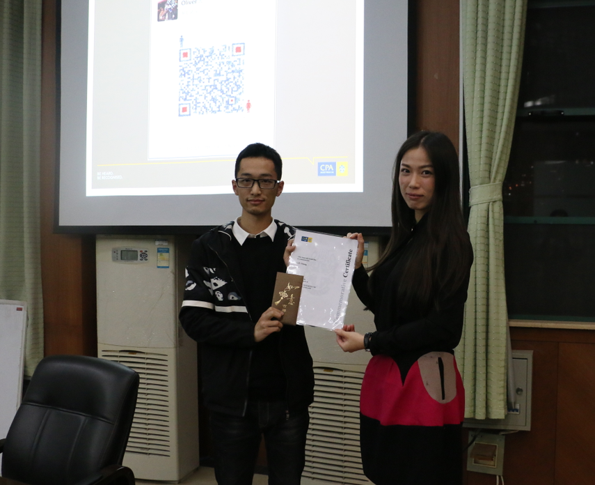 傅妮娜女士向同学们重点介绍了澳洲注册会计师的雇主选择和主要发展行业,并对澳洲会计师公会举办的各项活动进行举例,详细说明澳洲会计师公会对会员职业发展、技能提升和人脉拓展方面的帮助。分享会还邀请了获得2016年度澳洲会计师公会卓越奖学金的中澳班14级刘丞同学向各位同学分享澳洲注册会计师考试的经验。分享会后,傅妮娜女士为刘丞同学进行颁奖,以表彰他所取得的优异成绩。