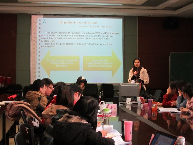 在主持人介绍各组成员与赛事规则后,比赛正式开始。首先是4个小组分别进行PPT展示。各小组就企业社会责任与盈余质量关系的这篇论文发表了各自的见解与看法。第2组徐倩同学以企业社会责任定义为切入点,通过详实的文献分析向大家阐述了企业社会责任与盈余质量的关系,并对文章中实证假设的提出做了理论分析,提出了自己新的看法。第5组林苗同学以提出问题、分析问题、解决问题和得出结论为框架,逐层介绍了假设提出、数据选取、建模与分析等方面,充分全面的介绍了文章内容。第6组曹阳同学通过文献回顾,详细向大家阐述了文章中假设的由来,并对模型和数据分析中的某些细节提出了自己的见解。第9组张金萍同学以一种平实的方式向大家介绍了企业社会责任与盈余质量的内在关联,并对模型中不同变量进行了解释,同时以中国的数据为基础,得出了与原文不同的结论,详实的数据,新颖的论点,赢得了在场观众的阵阵好评。在各组选手完成展示后,比赛进入自由辩论环节,在此过程中,双方就某些专业问题你来我往,互不相让。无论是对企业社会责任与盈余质量的内在关系,还是对模型构建存在的缺陷,辩论双方都提出了自己的观点,可以看出双方思维的活跃性与创新性。